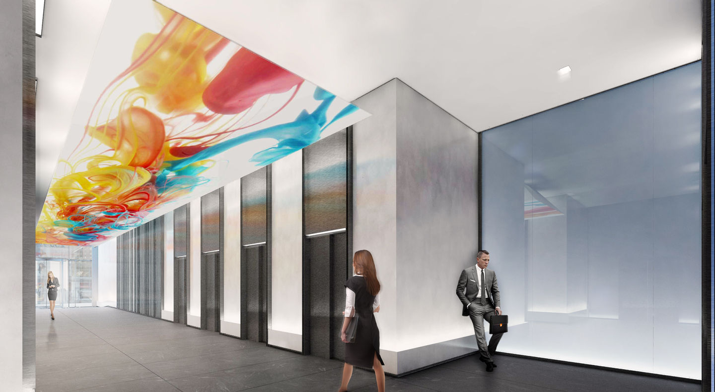 Investing in the 250 W 57th Street's repositioning was instrumental in allowing ESRT to attract higher-paying tenants to their real estate asset located within the center of the fast-changing “billionaire’s row.” Completed in November of 2017, the new lobby features an unprecedented 76’ long digital ceiling display, which imbues the space with a shifting array of color. In addition to the lobby renovation, we sought to honor the building’s historic integrity by finding design inspiration in its original façade for the modernization of the building's storefront. Utilizing historic photographs that were uncovered while conducting pre-design research, the new façade references the historic design in its rhythm, proportions, and color palate making for a consistent and polished storefront experience for visitors and passersby.